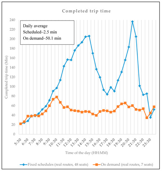 Completed trip time (CTT), or passenger-minutes travelled, is the sum of total travel time experienced by all travelers who completed their trips within the simulation period. This includes walking time, in-vehicle travel time and waiting time at stops and road crossings. The CTT results are presented in Figure 8 and show a significant benefit for on-demand services compared to scheduled buses. These results show that on-demand services can meet the same demand for travel while reducing the total passenger trip times. Figure 8 shows that during off-peak periods (e.g., 10 a.m. to 5 p.m.), the trip completion times for schedule buses are very high with large variability due to a long passenger waiting times as a result of running less frequent bus services. Figure 8 shows how on-demand bus services provided less variability in trip completion times making them more reliable for travelers to use. It is also interesting to point out that the on-demand bus services provided less variability when comparing peak and non-peak trip completion times allowing travelers to reach their desired destinations in the shortest amount of time compared to scheduled services. The daily average CTT was 112.5 minutes for scheduled bus services, compared to 50.1 minutes for the on-demand services (a reduction of 55% in CTT for on-demand services).