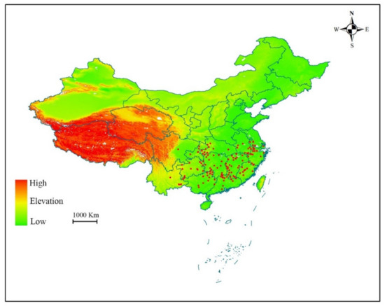 Occurrence data of S. tzumu was acquired from various sources, such as the Chinese virtual herbarium [23], the Global Biodiversity Information Facility [24], and our field survey, as well as literature reports. The longitude and latitude of few specimens (ca. 20) that give an exact village location were found using Google Earth. To reducing the possible errors of specific points, the locations that were duplicated or lack detailed information were deleted. Eventually, a total of 202 records were screened and used to model the distribution of S. tzumu (Figure 1).