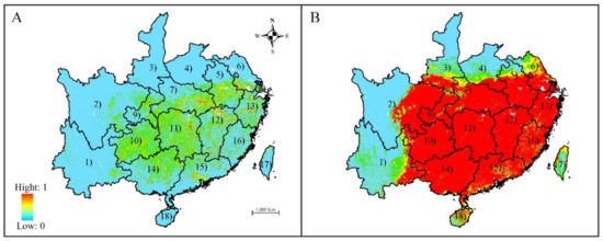 Predicted habitat suitability of Sassafras tzumu by Maxent (A) and GARP (B): (1) Yunnan; (2) Sichuan; (3) Shaanxi; (4) Henan; (5) Anhui; (6) Jiangsu; (7) Hubei; (8) Shanghai; (9) Chongqing; (10) Guizhou; (11) Hunan; (12) Jiangxi; (13) Zhejiang; (14) Guangxi; (15) Guangdong; (16) Fujian; (17) Taiwan; and (18) Hainan. Only the provinces where S. tzumu is predicted to occur are shown.
