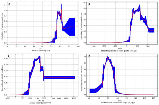 Response curves of relatively humidity (A), mean temperature of driest quarter (B), annual precipitation (C), and mean diurnal temperature range (D) based on the MAXENT algorithm for Sassafras tzumu in China.
