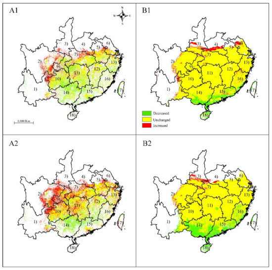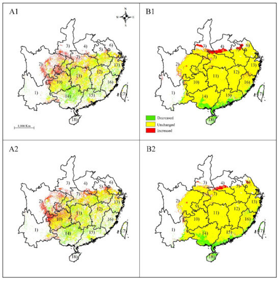 Changes in distribution area for Sassafras tzumu under climate change scenarios RCP 2.6 by Maxent (A1), (A2) and GARP (B1), (B2). (A1), (B1), scenarios for RCP 2.6–2050; (A2), (B2), scenarios for RCP 2.6–2070; (1) Yunnan; (2) Sichuan; (3) Shaanxi; (4) Henan; (5) Anhui; (6) Jiangsu; (7) Hubei; (8) Shanghai; (9) Chongqing; (10) Guizhou; (11) Hunan; (12) Jiangxi; (13) Zhejiang; (14) Guangxi; (15) Guangdong; (16) Fujian; (17) Taiwan; and (18) Hainan. Only the provinces where S. tzumu is predicted to occur are shown.
