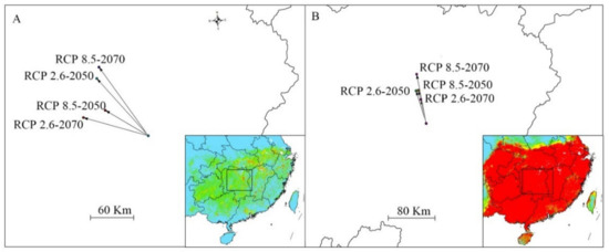 In the RCP 2.6–2050 climate scenario, MAXENT forecasted that the gains in suitable habitat areas of S. tzumu would be in the central Sichuan, southern Anhui, southern Shaanxi, northern Hubei, and south Jiangsu (Figure 4A1), which amounted to ca. 1.14 × 105 Km2 (Table 3). In addition, losses of suitable habitat area of ca. 1.12 × 105 km2 were predicted for Fujian and northern Guangdong. In the RCP 2.6–2070 climate scenario, MAXENT forecast that area of expanded distribution increase to 1.18 × 105 (Table 3), while the decreased habitat continued to decrease and accounted for ca. 0.98 × 105 km2 (Table 3). In the RCP 2.6–2050 and RCP 2.6–2070 climate scenarios, GARP predicted losses of appropriate habitat area accounting for ca. 1.38 × 105 km2 and 1.76 × 105 km2, respectively, in Guangdong and Guangxi (Figure 4(A1,B2)). Meanwhile, the areas of increased suitable habitat accounting for ca. 0.89 × 105 km2 and 0.27 × 105 km2 (Table 3) under RCP 2.6–2050 and RCP 2.6–2070 climate scenarios, respectively, were predicted for areas in southern Shanxi, and southern Anhui (Figure 4(A1,B2)). Overall, under RCP 2.6 scenario, MAXENT predict an increase in distribution while GARP predict a decrease in distribution. Nonetheless, both MAXENT and GARP predicted the distribution shift to northwest (Figure 5).