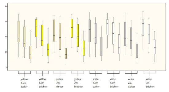 - Lasauskaite, R.; Reisinger, M. Optimal luminance of internally illuminated wayfinding signs. Lighting Res. Technol. 2017, 49, 521–533. [Google Scholar] [CrossRef]
