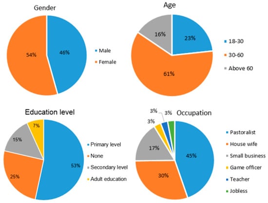 A total of 103 respondents, 54.4% females and 45.6% males, were engaged in this study. The majority of respondents were between the ages of 31 and 60 years old (61.2%), while the rest were between 18 and 30 years old (23.3%), and above 60 (15.5%). The study revealed that most of the respondents had the primary-education level (53.4%), secondary level (14.6%), and adult education (6.8%), while (25.2%) did not attend school. 44.7% of respondents were engaged in pastoralism as their occupation, while 30.1% were housewives and 17% were engaged in small businesses (Figure 1).