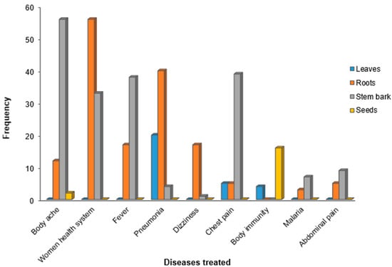 The most frequent diseases mentioned by respondents to be cured with the Z. chalybeum tree were: women’s health system (e.g., blood loss after labor, menstrual pain, early pregnancy complications) (86.4%), body aches (68%), fever (53.4%), chest pain (48%), and pneumonia (62.1%). Other mentioned diseases included abdominal pain (9%), general body immunity against diseases (19%), dizziness (15%), and malaria (10%) (Figure 2). According to the respondents, the plant was mostly used by all groups of people, but women were mostly using the plant after delivery to stop blood loss and reduce labor pain (76.7%). There was a strong relationship between plant part harvested and the disease cured (χ2 = 408.8, df = 24, p = 1.16 × 10−7).