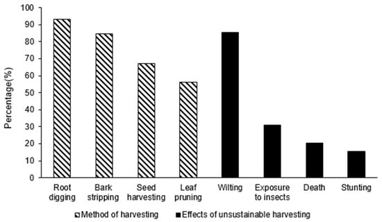 Ninety percent (90.3%) of respondents’ preferred using Z. chalybeum to other medicinal plants available in their area because of its efficacy in treating diseases. Respondents also mentioned other uses of the Z. chalybeum plant to be as beverage (porridge and tea) spice (83.5%), ruminant fodder (especially seeds) (58%), for Boma fencing (30%), and as firewood (11.6%). Respondents mentioned root digging (93.2%), bark stripping (84.5%), seed harvesting (67%), and leaf pruning (56.3%) as the main methods used for harvesting. Wilting, plant death, stunting, and exposure to insect damage were the effects mentioned by respondents (85.4%, 20.4%, 15.5%, and 31.1%, respectively) resulting from excessive and unsustainable harvesting methods practiced (Figure 3).