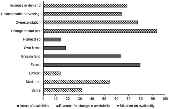 Represents the percentage (%) of respondents’ view of the situation of plant availability, reasons for the change in availability, and areas where they find the plant for harvesting.