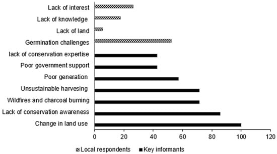 In this study, we also gathered information on people’s insights on conservation through domestication. Among respondents, 54.4% agreed on domestication/cultivation, while 45.6% disagreed, with the reasons for it being germination challenges (52.4%), lack of land (5.4%), lack of knowledge on tree propagation (17.5%), and lack of interest (26.2%). According to the data gathered from the key-informant discussion, conservation of medicinal plants in the area faces many challenges such as the change in land use to agriculture (99.9%), wildfires and charcoal burning (71.4%), weak government support for conservation (42.8%), unsuitable harvesting methods (71.4%), weak generation of medicinal plants (57.1%), and lack of conservation awareness among locals (85.7%) (Figure 6).