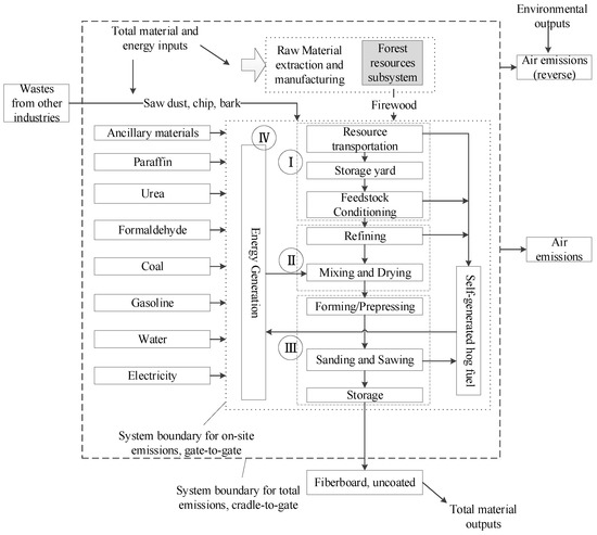 In this research, a case study method was employed to capture as many details as possible and to create in-depth insights [23]. A limited-scope life cycle assessment (LCA) procedure for a forest–board integration enterprise has been developed using thorough process theories and inventory data. The intended audience of the results of this study includes other LCA professionals, forest industry companies, environmental managers, government regulators, and bio-fuel developers. The results and methods of this study may be later used at different levels of data aggregation when considering industrial ecology and symbiosis or seeking sustainable survival and competitiveness.