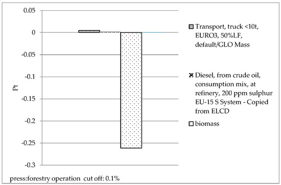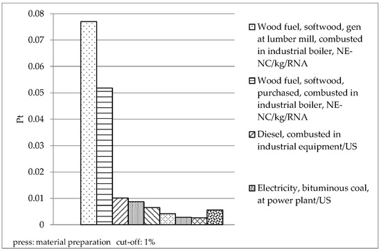 Furthermore, substances affecting the environment of hotspots are recognized through the contribution analysis separated for each stage (Figure 5, Figure 6, Figure 7 and Figure 8). The unwanted effects of the forest operation stage are mainly due to the harvesting, transportation, and use of oil, while the beneficial effects originated from the absorption of CO2 by tree growth in the cultivation. The most significant contributor to the environmental impacts in the material preparation stage of the fiberboard production is the fuelwood, which includes uses as raw materials and fuel. Other substances, including fossil fuels (such as oil and coal consumed in transportation) and power consumption, also impact the environment.