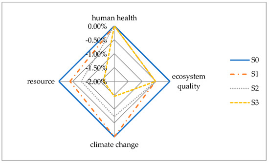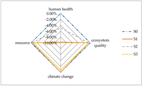 Reducing electric power consumption can improve the current conditions of resource consumption, climate change, and human health. In general, the high reduction of electric power can result in a decrease in environmental impacts. The most prominent scenario is S3, especially for the categories of climate change and resource consumption. With the increase in the proportion of reduction, climate change impacts and resource consumption impacts are reduced correspondingly. However, the proportion of ecosystem quality reduction remains stable.