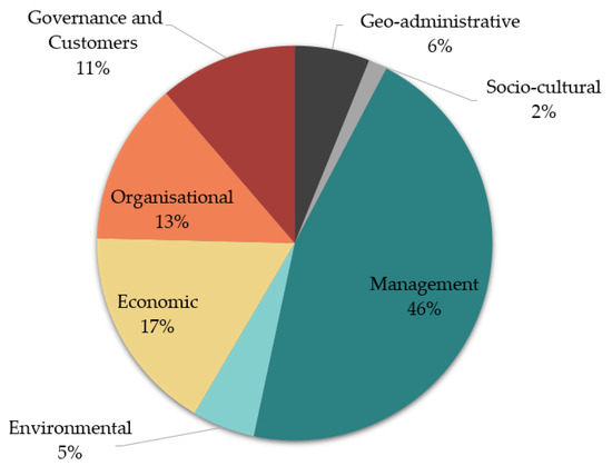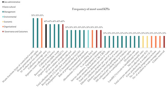 Based on the previous studies, we conducted a frequency analysis of KPIs used therein. The initial counting of KPIs was 195. The KPIs were grouped by categories similarly to Zaman’s approach [25]. Some of the KPIs were specially dedicated to particular cases of each MSW management system and may vary in line with the data available in each case. Hence, to facilitate this analysis we conducted a generalization of indicators of the same scope and reduced KPIs from 195 to 135. Figure 1 shows the share of indicators per category. Seven main categories were identified: management (46% of the KPIs used), economic (17%), organization (13%), governance and customers/consumers (11%), geo-administrative (6%), environment (5%), and socio-cultural (2%). Management related KPIs were the most employed. Figure 2 presents the 32 most popular KPIs among the studies surveyed. Most of those indicators regarded management and included (but were not limited to): waste fraction, waste per capita, separation rate, and collection frequency.