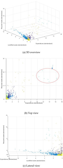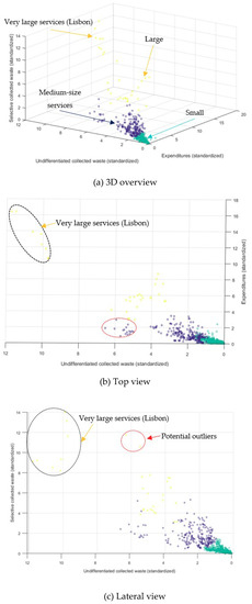 However, from a simple inspection of plots provided therein, we concluded that the group of large observations could be detached into two: large and very large. In terms of standardized variables, very large observations were the ones “consuming” more than 10 (standard deviations of) money spent on MSW management. In fact, these very large observations corresponded to the eight observations of Lisbon city, the capital of Portugal. The displacement of this group from the remaining sample motivated the exclusion of this municipality (and its observations) from our further analysis. Furthermore, from (c) we can identify two potential outlier observations, collecting more than 10 (standard deviations of) quantity of selective waste. These cases were also removed from the sample.