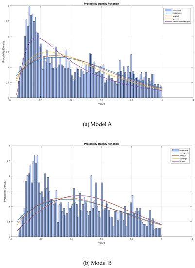 Regarding Model A, one can see that both the Birnbaum–Sanders and Weibull distributions were good approximations for the economic efficiency. We recall the results of Park et al. [43], Cazals et al. [38], and Daouia and Simar [44,45], who verified that the efficiency obtained through FDH and the partial frontiers (with α 1 or m ) asymptotically follow a Weibull distribution, although with unknown parameters. In this case,