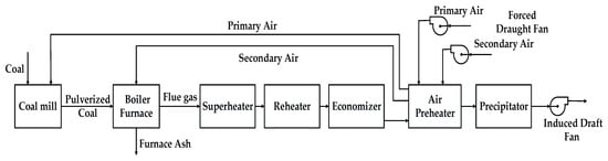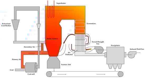 Combustion control is the most important aspect of boiler unit operation. The boiler combustion system is shown in Figure 1. The coal is crushed by the coal mill and blown into the boiler by the primary air. After the coal is burned in the boiler, the flue gas passes through the superheater, reheater, economizer and air preheater for heat exchange. Finally, the flue gas is discharged into the atmosphere.