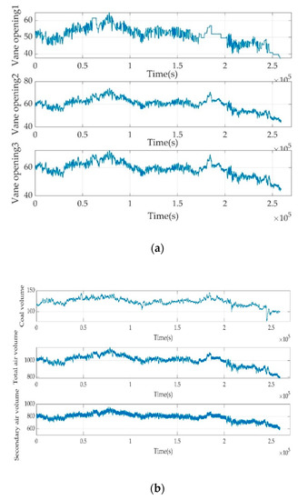Field data. (a) Vane opening1: Adjustable vane opening (AVO) of forced fan (%); Vane opening2: AVO of induced fan A (%); Vane opening3: AVO of induced fan B (%). (b) Coal volume (kg/s); total air volume (m3/h); secondary air volume (m3/h).