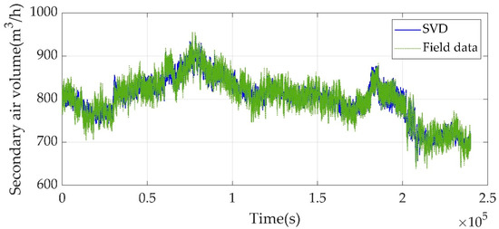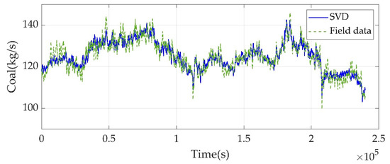 According to the filed data we get, can be composed of secondary air volume and coal volume. is a matrix of 250,000 × 2. Then, 95% of the sum of diagonal elements of is chosen to form a new . At last, a new matrix as the new secondary air volume and coal volume after noise reduction is recombined. is a factorization of the form . The corresponding sub-matrixes and are extracted from and , according to the length of the rows and columns of . Through SVD de-noising, the secondary air volume and coal are shown in Figure 5 and Figure 6.