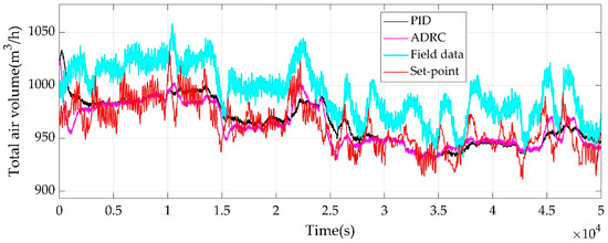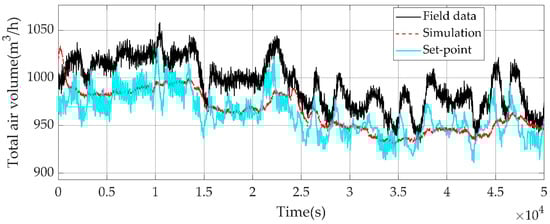 The simulation time is 50,000 s. It can be seen from Figure 11 and Figure 12 that the simulation of the total air volume is consistent with the fluctuation of the actual value. The simulation is near the set-point. The differences between the actual data and the simulation data exist due to the absences of the unknown disturbances and measurement noises in the simulation system, and it does not much affect the purpose of control design. In general, the data classification method and identification method are feasible. It is seen from Figure 12 that the actual control strategy does not track the set-point tightly and thus needs improvement for better control effect.