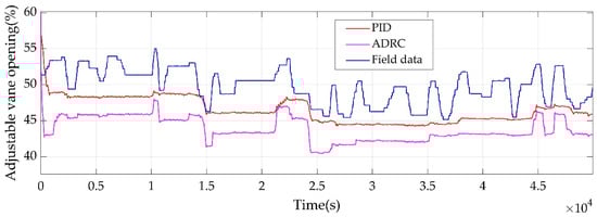 It can be seen that, thanks to the compensation mechanism of ADRC, the simulation fluctuation of total air volume is greatly reduced and tightly closer to the set-point compared with single PID controller. Meanwhile, the AVO of forced draft fan is smaller than the actual data and the simulation of PID control. Therefore, the ADRC shows the better performance in the forced draft control.