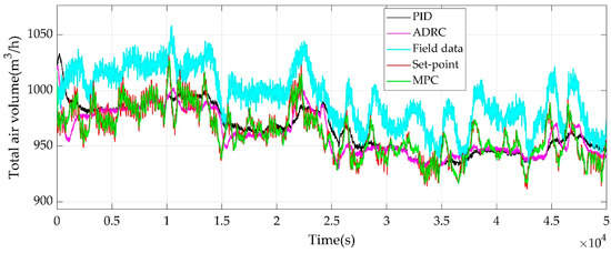 As can be seen from Figure 19 and Figure 20, the simulation of the total air volume can almost completely fit the set-point, especially when the set-point fluctuates greatly. At the beginning of simulation, compared with ADRC and single PID controller, the total air volume under MPC control has no obvious mutation. However, compared with ADRC and single PID, the AVO fluctuates greatly, which cannot meet the actual demand. The great fluctuation may cause various problems for the AVO.