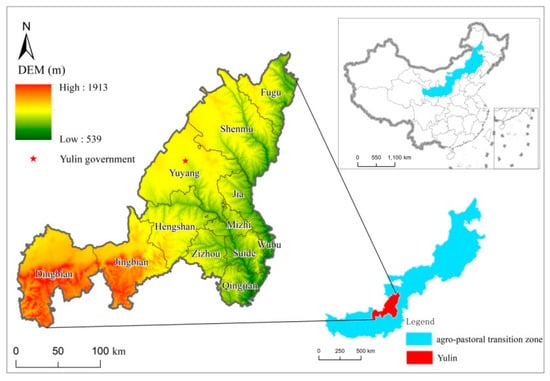 Yulin City located in Shaanxi Province of Northwest China. Northern wind-sand-grass shoal and southern loess hilly-gully regions account for 36.7% and 51.8% of the total area of Yulin, respectively (Figure 1). The temperate arid/semi-arid continental monsoon climate dominates this region, with a mean temperature of 8.4 °C, a mean precipitation of 398.3 mm, and cumulative sunshine of 2594–2914 h. The southern region has higher mean temperature and annual precipitation than the northern region while the cumulative sunshine of southern region is lower than that of the northern region. Yulin is an important resource-based city in China in terms of coal, oil, natural gas, and rock salt. Secondary and tertiary industries play the dominant role in Yulin economic development. All of the mineral resources are mainly distributed in the six western to northeastern counties, including Dingbian, Jingbian, Hengshan, Yuyang, Shenmu, and Fugu (Figure 1). Yulin has been recognized as the key area of national targeted poverty alleviation, with eight national-level poverty-stricken counties, including Jia, Mizhi, Zizhou, Suide, Wubu, and Qingjian counties in the southeast, and Dingbian and Hengshan in the northwest.