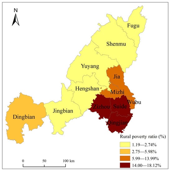 Yulin has been famous for the successful restoration of Mu Us Sandy Land in the last 40 years. Massive ecological construction projects, such as the Grain-for-Green program, grazing prohibition, and Three-North Shelterbelt Forest Program, significantly increased normalized difference vegetation index with the rate of 0.0076 year−1. Ecological quality of Yulin has been improved continuously during the period 1990–2010 []. However, Yulin has a large proportion of its population that is dependent on the farming and animal husbandry, mainly distributed in the south areas. Agricultural development has been neglected since scale natural resource exploitation from the 1980s []. We hypothesized that a higher poverty ratio was found in the regions with a higher proportion of agricultural economy. In addition, we also hypothesized that improving agricultural economic benefit measures, such as agricultural specialization and structure adjustment, could help reduce rural poverty. Our results will provide a theoretical foundation for regional agricultural and rural sustainable development.