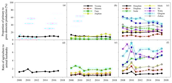 The ratio of agriculture to animal husbandry firstly increased from 1.26 in 2008 to 1.94 in 2010, and then decreased to 1.54 in 2017. Wubu, Suide, Jia, and Qingjian counties had the highest ratio of agriculture to animal husbandry, with values of more than 3 from 2008. The ratio of agriculture to animal husbandry was below 1 in Jingbian, Shenmu, Hengshan, and Yuyang counties, which is lower than the average level of Yulin (Figure 3b).
