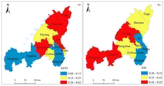 Spatial analysis of the agricultural structure variability index (ASVI) (a) and agricultural specialization index (ASI) (b) in Yulin City during 2008–2017.