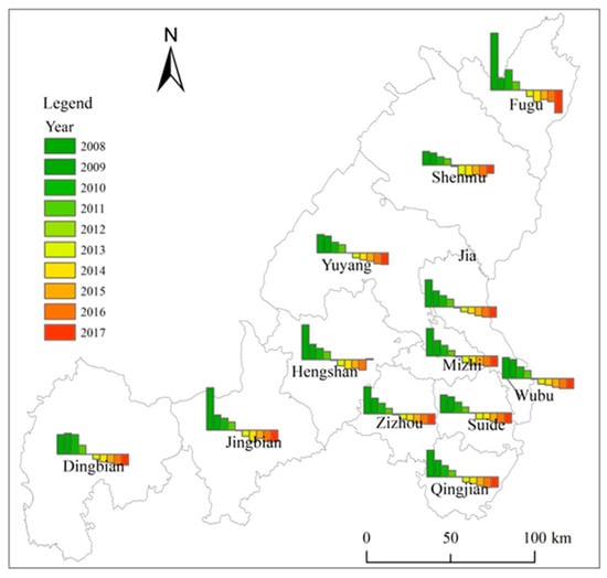 Rural per capita net income in Yulin increased from 3668 yuan in 2008 to 12,999 yuan in 2017. The highest and lowest rural per capita net income were found in Shenmu and Jia, respectively. During 2008–2017, rural per capita net income in Shenmu ranged from 6028 yuan to 17,537 yuan, while it increased from 2731 yuan to 10,514 yuan in Jia. West to northwest counties had higher rural per capita net income values than the average level of Yulin, while the rural per capita net income values in southeast counties were lower than the average level of Yulin (Table 1).