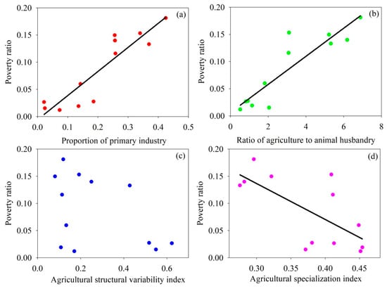 Relationships between rural poverty and proportion of primary industry (a), ratio of agriculture to animal husbandry (b), agricultural structural variability index (c), and agricultural specialization index (d) in Yulin City.