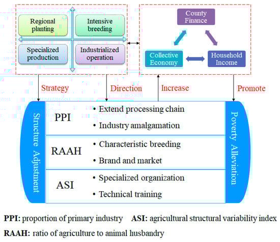 The Chinese government will decrease grain production while encouraging forage development. Therefore, we suggest regional planting, intensive breeding, specialized production, and industrialized operation as the strategies and directions for tackling rural poverty. The agricultural structure can be adjusted from the aspects of proportion of primary industry, ratio of agriculture to animal husbandry, and agricultural specialization index. An extended processing chain will enhance agricultural competitiveness and promote industry amalgamation. Characteristic breeding, brand, and market establishment can improve livestock and husbandry development, and thus decrease the ratio of agriculture to animal husbandry. Specialized organization and professional technical training will support agricultural specialization. Overall, agricultural structure adjustment can provide a guarantee of rural poverty alleviation by increasing the county finances, collective economy, and household incomes (Figure 7). In addition, we also recommended rural poor migration to reduce rural poverty in Yulin. Ex situ relocation is an important measure in China’s targeted poverty alleviation strategy. Distinctive industries were developed to left the relocated households out of poverty by agricultural scaling planting and industry amalgamation []. In Dingbian County, rural industry development was coordinated with the relocation projects to increase the income of relocated poor households. A total of 18,127 poor populations were relocated near tp the agricultural products’ gather and distribution parks. All the relocated poor households obtained high-quality farmland and industrial development capital to develop facility agriculture [].
