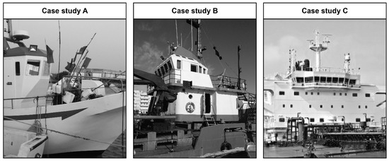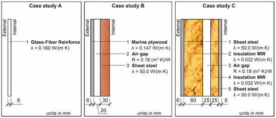The methodological framework of this research was established by the workflow included in Figure 1. First, a representative sample of 3 ships was selected. The accommodation spaces of these ships should have different insulation configurations in the respective superstructure, whose technical documentation on the disposition of the different materials’ layers was available (e.g., the project of the ship). Further, case studies with an acceptable conservation state were selected to guarantee no alterations in the thermal properties of the project data (e.g., the ageing of materials which could change the thermal conductivity value included in the project [31]). Therefore, ships whose accommodation spaces were recently built were selected: an offshore fishing boat, a suction dredger, and a tank ship (see Figure 2). Figure 3 indicates the constructive composition and the thermal properties of the 3 superstructures analyzed. It is important to stress that these superstructures correspond to accommodation spaces in contact with the air. This research is therefore not aimed at thermally characterizing the elements of the ship in contact with the water. To carry out the tests, a data logger (ALMEMO 2590-4AS) with thermocouples (T 190-2) and a plate (FQA018C) were used (see Table 1). Probes were placed according to the following criteria [32]: (i) a total of 3 sensors of internal surface temperature were placed at a height of 1.5 m, at a distance of 15 cm, and joint by a heat-conducting adhesive; (ii) the plate was also placed at a height of 1.5 m; and (iii) the thermocouples to measure the ambient temperature were put at a height of 1.5 m and horizontally separated from the wall at a distance of 30 cm. Figure 4 shows an example of how the probes were placed. Measurements were conducted during a period of 3 days in the case studies A and B, and of 7 days in the case study C. Tests were carried out when ships were not navigating, and the time of data acquisition was 5 min.