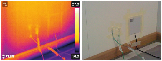 It is also worth stressing that before placing the probes, the possible presence of thermal bridges in the internal layer was assessed to avoid putting the probes near to them (e.g., steel studs for the placing of the layer of the internal finish). For this purpose, the infrared camera was used as Figure 5 shows. The emissivity was determined by the procedure of a contact thermometer indicated in ASTM E1933 [58]. As the range of the internal temperature in internal spaces did not present great variations, it could be considered that the emissivity did not vary [59], so the emissivity was only determined once during the test.