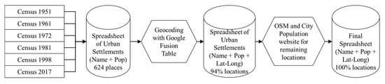 - Extraction of declared urban areas from the census dataEvery national census (1951, 1961, 1972, 1981, 1998 and 2017) has declared a set of settlements as ‘urban’, based on varied definitions. The census data has been published by Pakistan Bureau of Statistics in the form of PDF documents without digitally sortable tables. PDF to MS Excel conversion with optical character recognition (OCR) techniques, along with a Python based rows sorting mechanism, have been applied to extract data, which was then manually sorted to pick urban settlements. Finally, a matrix has been generated to document the increase in the number of declared urban settlements over the census periods among various provinces. The urban settlements have been mapped using the geocoding process to visualize the temporal increase in urban areas. To geocode the place names, a combination of Google Fusion Tables and place names from Open Street Maps (www.openstreetmap.org) and City Population (http://citypopulation.de/) have been used (See Figure 1).
