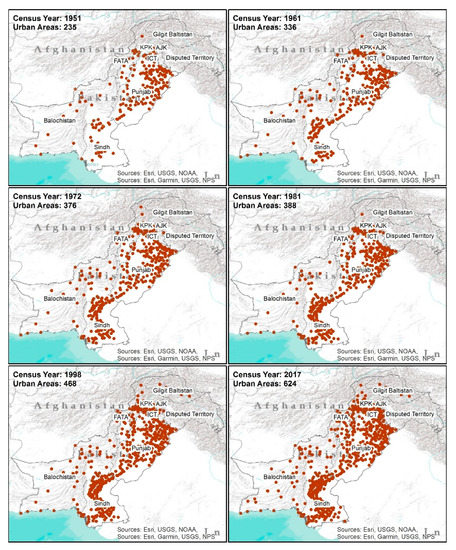 - Arif, G.M.; Sabiha, I.; Tauseef, A. The Process of Urbanisation in Pakistan, 1951–1998. Pak. Dev. Rev. 1998, 37, 507–522. Available online: http://www.jstor.org/stable/41261068 (accessed on 15 May 2020). [CrossRef]