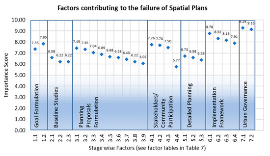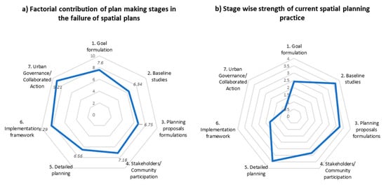 | Urban Plan Making Stage | No. of Factors | Score Representing Stage’s Role as ‘Contributor to Failure’ | Strength of Traditional Plan Making Process |