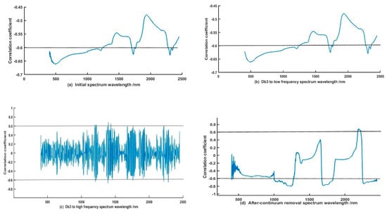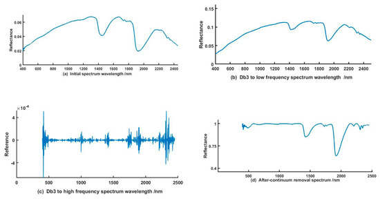 Initial and after-continuum removal spectra were used as references (Figure 6a–d) to compare and analyze the spectral characteristics of different pretreatment methods. These methods included db3 to low-frequency (Figure 6b) and db3 to high-frequency spectra (Figure 6c) obtained by decomposing the initial spectrum through db3 wavelet packet decomposition and CR-db3 to low-frequency spectrum (Figure 6e) and CR-db3 to high-frequency spectrum (Figure 6f) obtained by combining continuum removal and wavelet packet decomposition.
