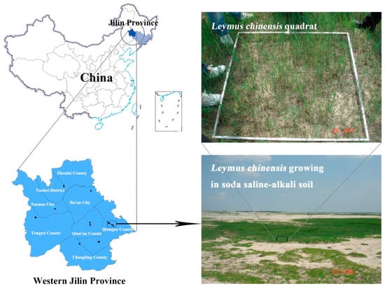 The study area is located in the southwest part of the Songnen plain in western Jilin Province (123°09′ E–124°22′ E, 44°57′ N–45°46′ N), where there is a semi-arid and sub-humid continental monsoon climate with four distinct seasons [28]. Mean annual precipitation ranges between 400–500 mm and the mean annual evaporation ranges between 1500–1900 mm, with a maximum temperature of 23 °C in July and minimum temperature of −17.5 °C in January. As western Jilin Province is a closed-flow area, with a high degree of groundwater mineralization and salt accumulation, saline-alkali soils have fully developed in this area. The plant communities are mainly dominated by L. chinensis, accompanied by Calamagrostis epigeios, Arundinella hirta, Chloris virgate, Puccinellia tenuiflora, Suaeda glauca, and various other grasses. Soil types include light chernozem, meadow, sandy, chernozem, alkali, and chestnut soils. The location of the study area is shown in Figure 1.