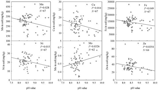 Data presented in Figure 2, Figure 3 and Figure 4 show that in stark contrast to Fe, Cu, Ni, and Mn contents, Mo contents slightly increased with increases in soil pH, total alkalinity, and Na contents. This is consistent with expectations, as the main factors affecting soil Mo content are soil pH, texture, and Fe content. Mo contents generally increase with increases in pH, and risks of Mo deficiency in plants rise with increases in soil pH above 6 [18]. Thus, as the soda saline-alkali soil has high pH (>8), the variations in Mo differ from those of the other microelements. Previous studies [15] have shown that high NaHCO3 contents can also induce plant Zn deficiency by raising the soil pH and thus promoting formation of Zn forms that plants cannot use. In contrast, we found a slight increase in plant Zn with increasing soil Na content (Figure 4). The reasons for this discrepancy warrant attention in future studies.