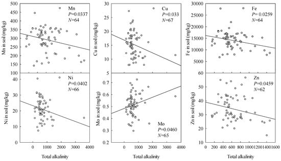As shown in Figure 2 and Figure 3, soil contents of all the measured microelements except Mo tended to decrease with increasing soil pH and total alkalinity. This is consistent with expectations because increases in pH generally increase adsorption of Mo in the soil, but reduce adsorption of the other microelements.