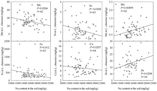 In accordance with findings that Na is the main element that impedes plant growth in the soil of the study area [19], contents of four of the microelements in L. chinensis tended to decrease with increases in the soil’s Na content (Figure 4). The exceptions were Mo and Zn, contents of which slightly increased with increasing Na content in the soil.