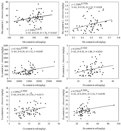 Generally, Mn, Fe, Ni, Cu, Zn, and Mo contents of healthy plants are reportedly 50–200, 100–300, 1–5, 5–20, 25–150, and 0.1–1.0 mg/kg, respectively [33,34]. As shown in Table 2, average contents of these elements in the sampled L. chinensis plants were 32.9, 421, 1.30, 7.06, 17.8, and 0.77 mg/kg, respectively. Thus, they had abundant Fe, ample Ni and Mo, low Cu contents, and substantial deficiencies in Mn and Zn.