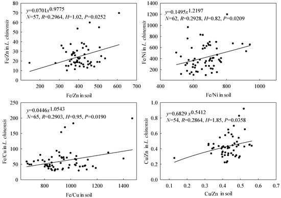 Pearson correlation analysis showed there were very significant correlations (p < 0.01) between nine pairs of the measured elements (Fe and Mn, Ni and Mn, Ni and Fe, Cu and Mn, Fe and Cu, Cu and Ni, Zn and Mn, Fe and Zn, Cu and Zn) in both soil and L. chinensis (Table 3).