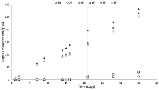 Biogas production over time with the dotted line indicating a 21 day operational period, equal to operating times of industrial biogas plants. The numbers indicate the sizes of the bioplastics (1 × 1 cm, 2 × 2 cm, and 3 × 3 cm), while F stands for foil and R stands for rigid.