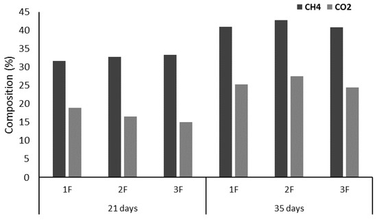 Bioplastic film produced cumulative biogas of 197 (1F), 146 (2F), and 138 mL (3F) per gram volatile solid added for the first 21 days and 283 (1F), 264 (2F), and 252 (3F) mL per gram volatile solid added at the end of 35 days, as shown in Figure 1. The 1 × 1 cm bioplastic film showed maximum biogas production among other sizes during all periods of incubation. The 2 × 2 cm and 3 × 3 cm bioplastic films showed a similar pattern of biogas production. Sizes of plastic showed a small difference in the biogas production, with smaller pieces of plastic producing more biogas than larger pieces.