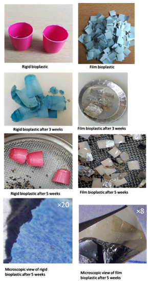 - Adamcová, D.; Elbl, J.; Zloch, J.; Vaverková, M.D.; Kintl, A.; Juřička, D.; Hladký, J.; Brtnicky, M. Study on the (bio)degradation Process of Bioplastic Materials under Industrial Composting Conditions. Acta Univ. Agric. Et Silvic. Mendel. Brun. 2017, 65, 791–798. [Google Scholar] [CrossRef]