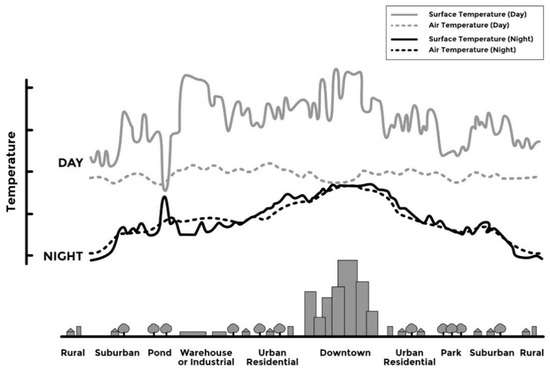 In general, the urban heat island increases with the size of the urban agglomeration and, according to the Environmental Protection Agency (EPA, 2008) [153], many cities in the United States have air temperatures up to 5–6 °C higher than those of the surrounding non-urbanized environment. Similar values (up to 7.26 °C) were found in a study carried out in Japan comparing different types of parking with the presence or absence of trees [154]. Atmospheric urban heat islands are often weak during the morning and throughout the day and become more pronounced after sunset due to the slow release of heat from urban infrastructures. The timing of this peak, however, depends on the properties of urban and rural surfaces, the season, and prevailing weather conditions [153]. Surface temperatures have an indirect, but significant, influence on air temperatures. However, because air mixes within the atmosphere, the relationship between surface and air temperatures is not constant, and air temperatures typically vary less than surface temperatures across an area (Figure 1) [153].
