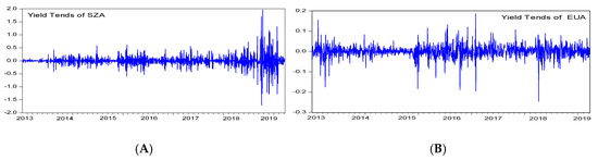 In this subsection, we investigate the price mechanisms of the SZA and the change patterns of the yield of the SZA using a GARCH model. The yield of the SZA is , where is the daily closing price. The statistical descriptions of the SZA and EUA are displayed in Table 2, and their trend graphs are displayed in Figure 2.