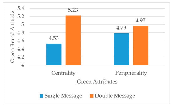 It was found that the centrality or the peripherality of a product’s green attributes affects consumers’ perception of the product [,]. Consumers typically evaluate the central attributes of a product to guide their purchase. If the central attribute of the product is related to green attributes, based on consumers’ impression that green products have inferior quality, a single message with green attributes as its centrality attribute results in a more negative green brand attitude among consumers. If a double message is employed, the message with product functional performance compensates for or improves consumers’ initial impression that green products have inferior quality, and such fluctuation in consumer perception widens the difference between double and single messages.