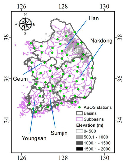 South Korea lies between latitudes 34° N and 38° N and longitudes 126° E and 130° E and includes five large river basins: the Han River basin, Nakdong River basin, Geum River basin, Sumjin River basin, and Youngsan River basin (Figure 1). These five large river basins are divided into 109 subbasins based on geographical characteristics (26 subbasins for the Han, 33 subbasins for the Nakdong, 21 subbasins for the Geum, 15 subbasins for the Sumjin, and 14 subbasins for the Youngsan River basins). South Korea has four distinct seasons: spring from March to May, summer from June to August, autumn from September to November, and winter from December to February. However, the climatic conditions vary significantly among the seasons and are dependent on both continental and oceanic effects. The temperature in summer ranges from 22–25 °C due to Pacific high pressure, while in winter, it ranges from −5 °C to −3 °C depending on the elevation. The mean annual precipitation generally increases from north to south with approximately 1500 mm in the middle of Korea [20]. Additionally, approximately 70% of the annual precipitation occurs during the summer, which is the rainy season in Korea; winter is the driest season and constitutes less than 10% of the total annual precipitation. Figure 2 shows the mean monthly values for the minimum temperature, maximum temperature, and precipitation in South Korea.